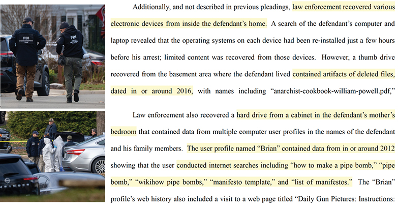 The “Brian” profile on the hard drive made internet searches “in or around” 2012 using terms including “how to make a pipe bomb,” “pipe bomb,” “wikihow pipe bombs,” “manifesto template” and “list of manifestos,” prosecutors wrote in a 21-page federal court filing.